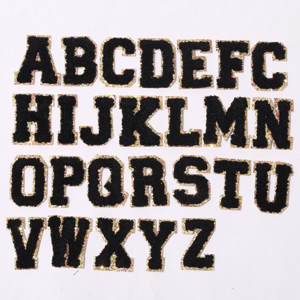 Item : A-Z Towel English Alphabet Custom Embroidered Varsity Gold Glitter Border Iron On Chenille Letters Patches